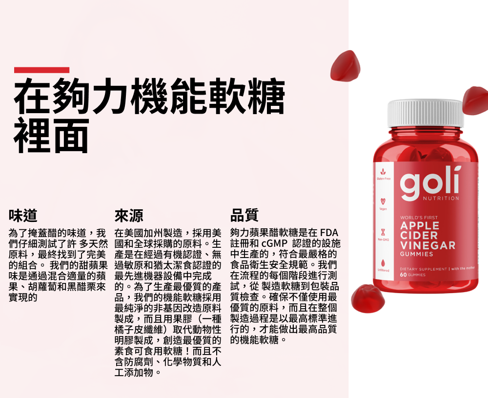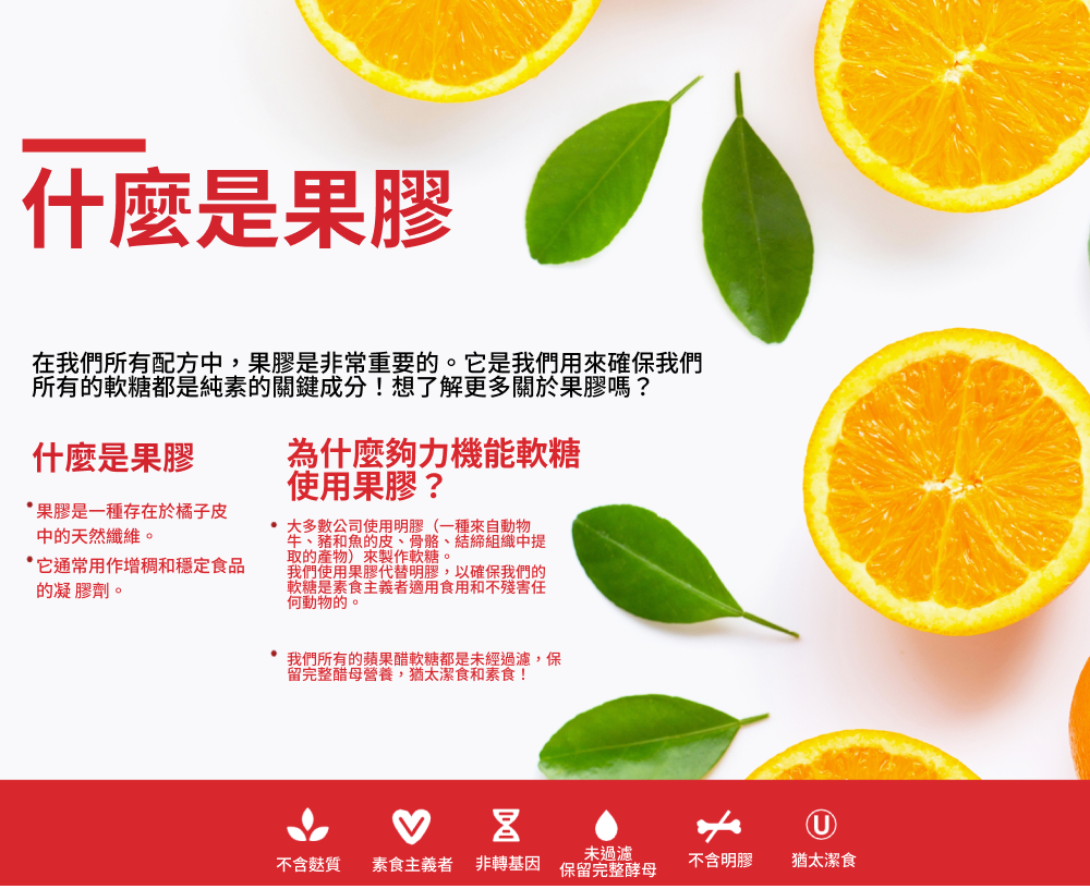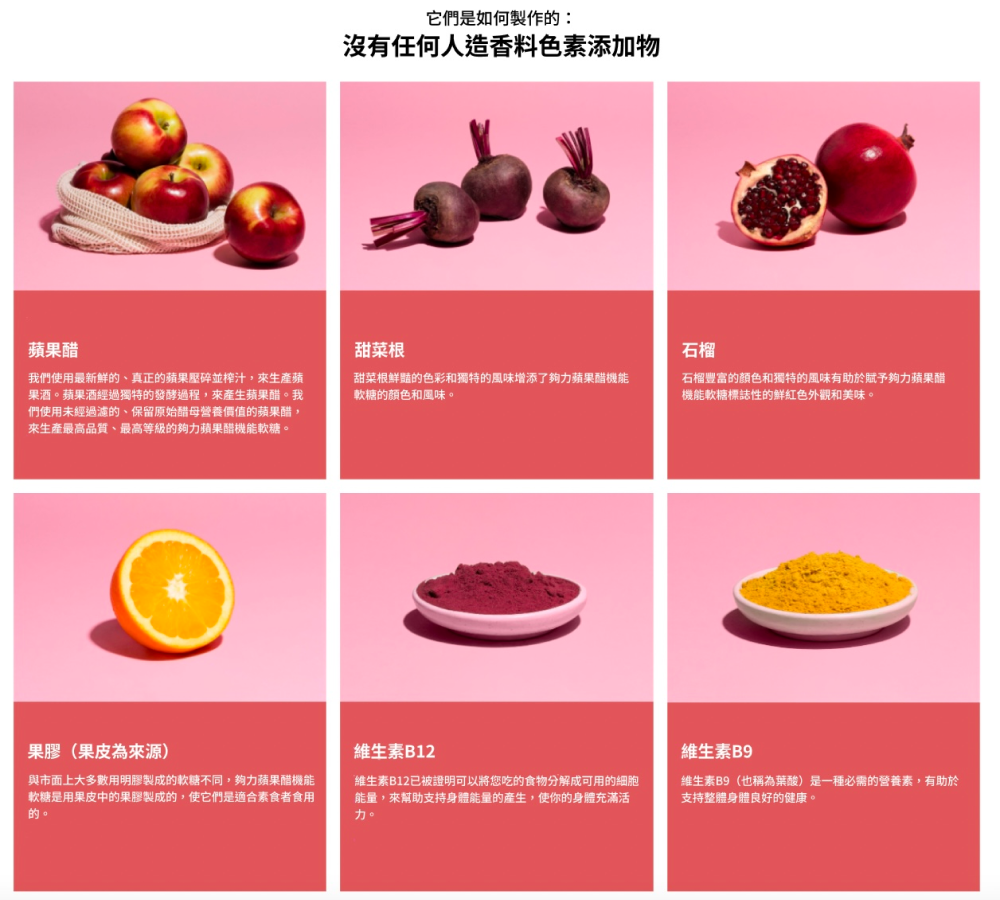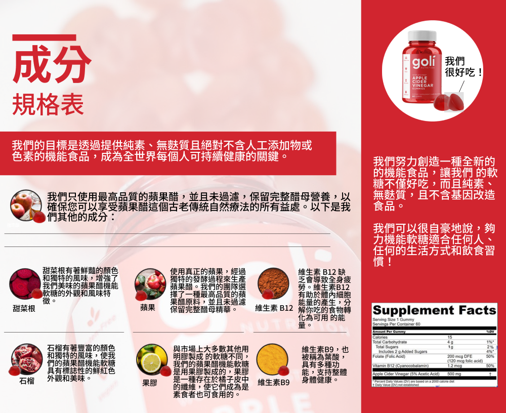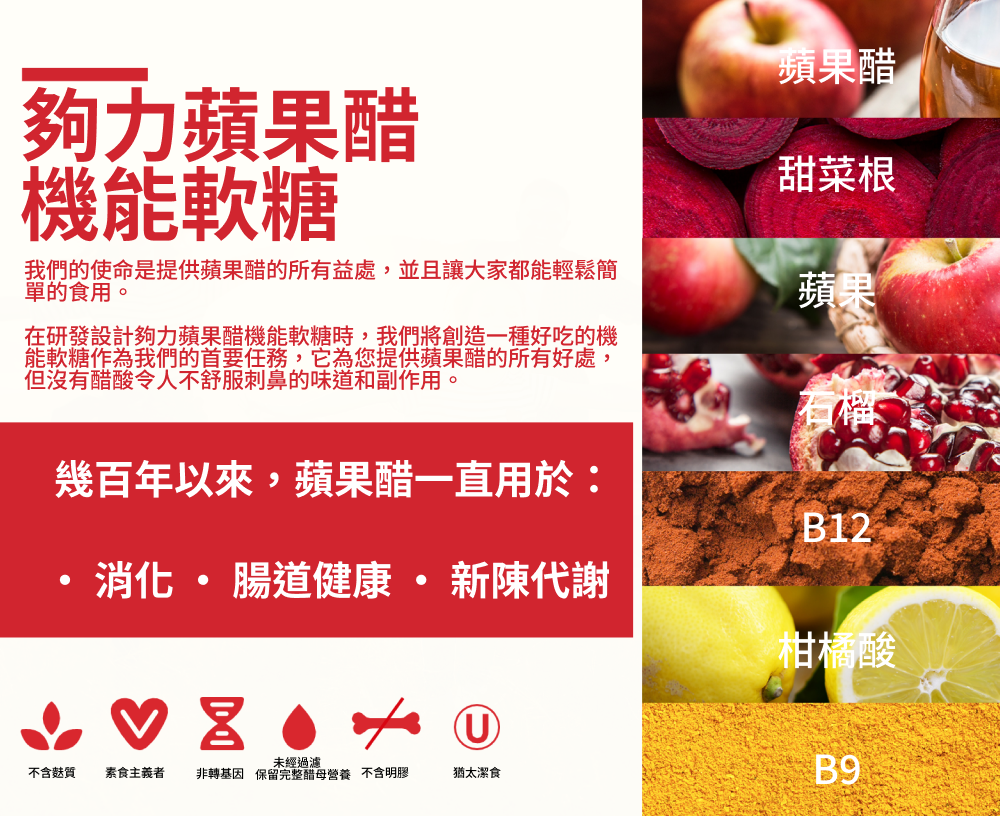 成 分 : 蘋果醋,甜菜根,石榴,木薯,水,蔗糖,果膠(柑橘皮來源),檸檬酸鈉,檸檬酸,DL-蘋果酸,天然蘋果香料,蔬果汁(蘋果,胡蘿蔔,黑醋栗),葉酸,維生素B12